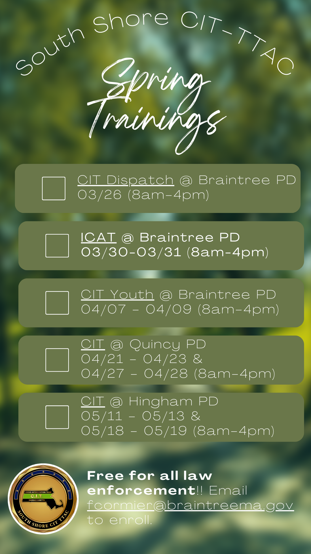 The South Shore Regional CIT-TTAC is based out of Braintree, MA and serves the towns and cities within Norfolk, Plymouth, Barnstable and Bristol counties. If you would like to develop, or strengthen your community’s Crisis Intervention Team, contact fcormier@braintreema.gov.